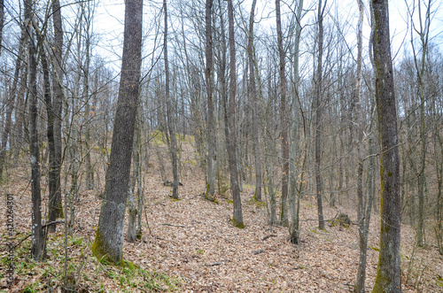 Fototapeta premium Forest in winter. Trees without leaves. Cloudy winter day in woods.