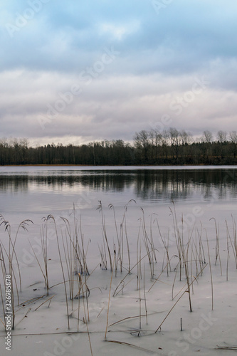 Fototapeta premium Forest Lake begins to become covered with ice.