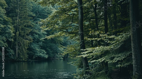 Obraz premium Forest lake, tranquil scene, lush trees, background mist, nature