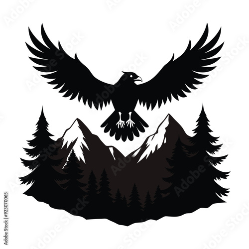 © Shineoxstock, Obraz premium Forest Landscape illustration, Eagle in flight T-Shirt Design Vector