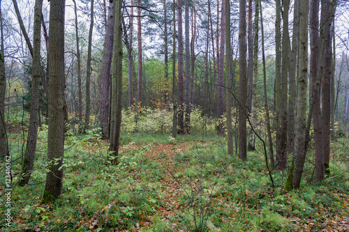Fototapeta premium Forest landscape in cloudy and rainy autumn day