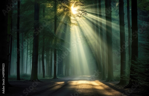 © Aimee, Fototapeta premium Forest landscape. Sunlight filtering through forest trees