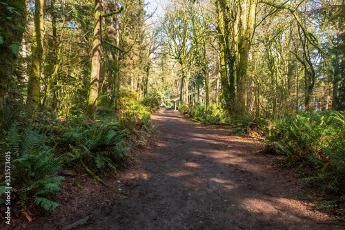 Naklejka premium Forest landscape with wide walking trail amidst trees and sunlight at Point Defiance Park in Tacoma, Washington