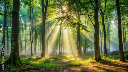 © Watcharapon, Fototapeta premium Forest mist rises slowly from forest floor as morning sun casts dappled shadows through leafy canopy, mist