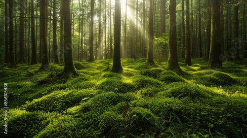 © Roman, Obraz premium Forest moss sunbeams. Generative AI