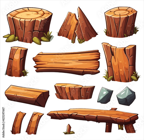 © mit, Naklejka premium Forest nature elements landscape set with tree, stump, old trunk, bush, stone pile and moss in cartoon style isolated on white background. Ui assets, for computers game interface vector Illustrations