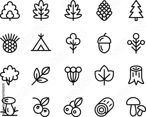 © Creatives Selim, Fototapeta premium Forest nature icons set, tree leaves symbols, pine cone illustration, mushrooms and berries, camping tent vector, acorn, wood log, foliage elements.
