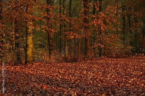 © The 2R Artificiality, Obraz premium Forest of beech trees bathed in backlight with a ground covered in dry leaves during autumn