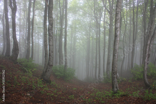 © Alessia, Obraz premium forest of beech trees surrounded by vegetation and dense mountain fog