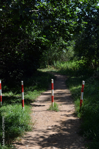 Fototapeta premium Forest of deciduous trees with a path, a small walking path that stretches along Bug River of village Rybienko Nowe, city Wyszkw, Poland. Unusual natural landscapes with forest, river and blue sky.