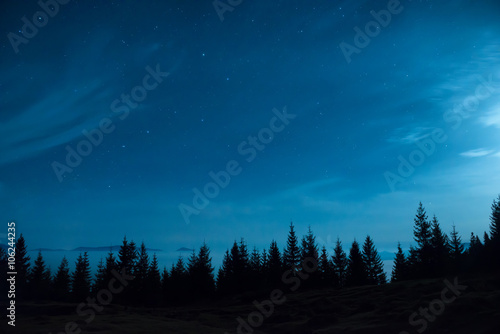 © Pavlo Vakhrushev, Fototapeta premium Forest of pine trees under moon and blue dark night sky