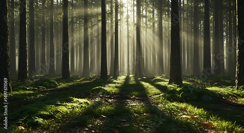 Fototapeta premium Forest of tall trees bathed in bright sunbeams filtering through the green...