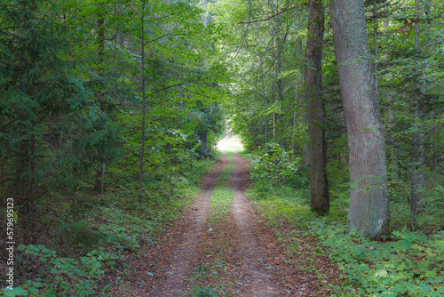 Fototapeta premium Forest on moody autumn day. A gravel road through the forest