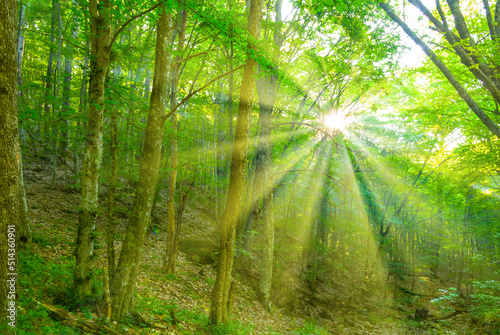 Naklejka premium forest on mount slope with sun rays push through th trees