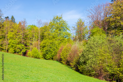 Naklejka premium forest on the hill in spring. beautiful nature scenery on a sunny day. meadow in fresh green grass