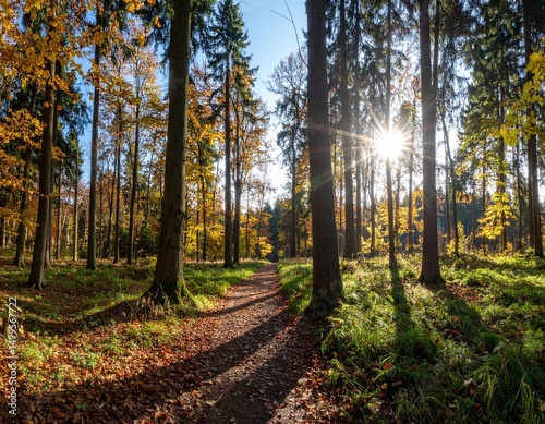© Adi, Fototapeta premium Forest panorama in autumn with hiking trail and sun shining through the trees