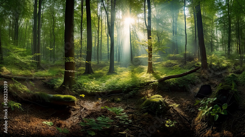 Obraz premium Forest panorama with sunbeams, morning, wide shot, green forest.