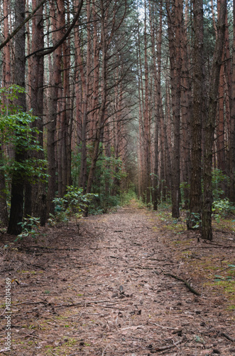 © LukeS, Obraz premium Forest path among trees cloudy day