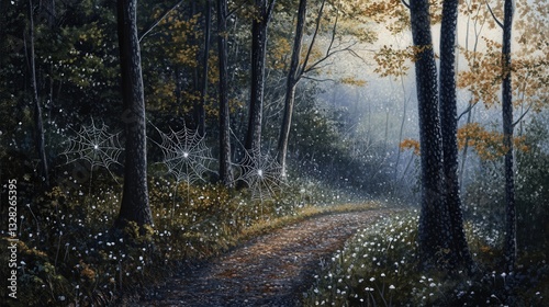 © Thirawat, Fototapeta premium forest path at dawn, with delicate dew drops glistening on spiderwebs between the trees