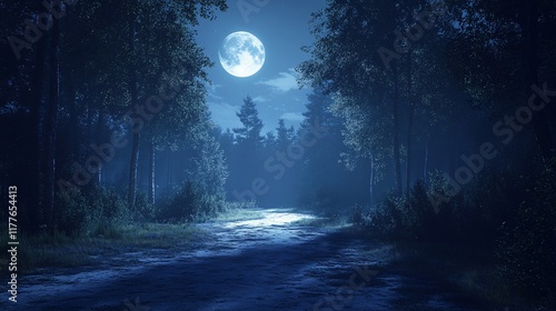 Naklejka premium Forest path at night illuminated by bright moon over trees, fantasy scenery