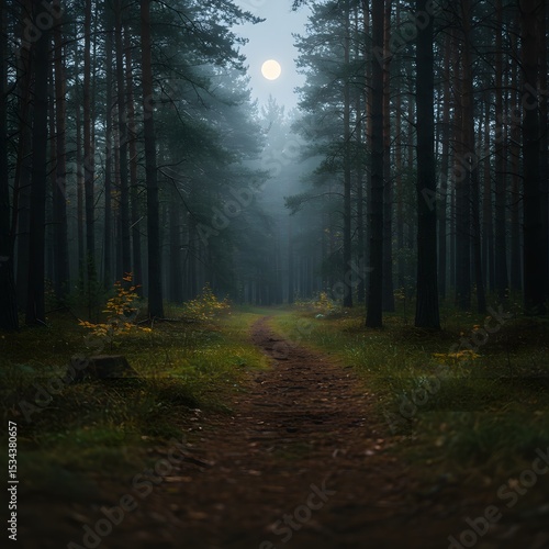 © OmRioRio, Obraz premium Forest Path at Night with Moon