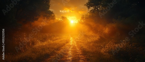 Naklejka premium Forest Path at Sunset, a tranquil scene where a winding trail disappears into...
