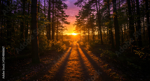 © Rita, Fototapeta premium Forest Path at Sunset with Vibrant Sky and Long Shadow