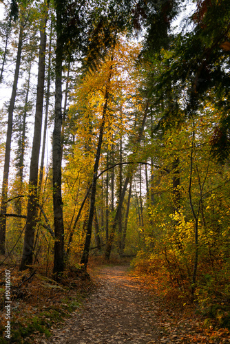 © maxdigi, Obraz premium Forest Path Autumn Birch Tree Lined.Fall forest background with hiking trail