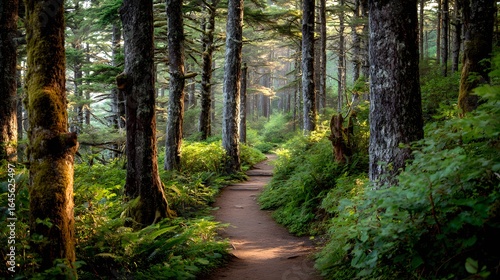 © rehan, Obraz premium Forest path bathed in golden sunlight.