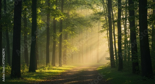 Fototapeta premium Forest path bathed in sunlight Trees line path as mist and light create...