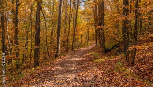 Obraz premium Forest path blanketed in fall foliage, seasonal change