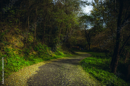 © Forance, Fototapeta premium Forest Path Covered with Fallen Leaves in Natural Light