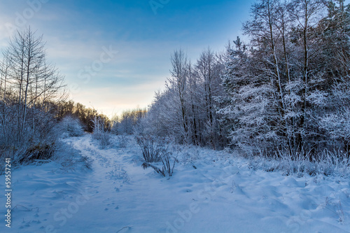 Obraz premium Forest path covered with snow at sunrise