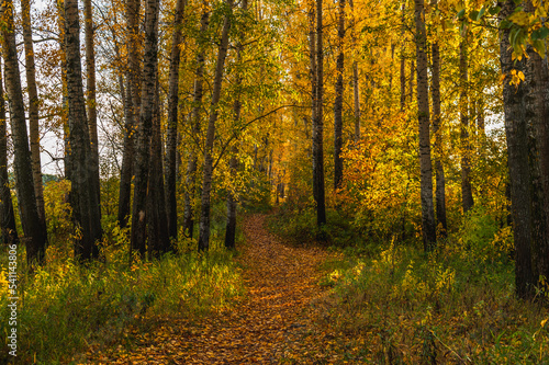 © Natalia, Obraz premium Forest path covered with yellow fallen leaves.