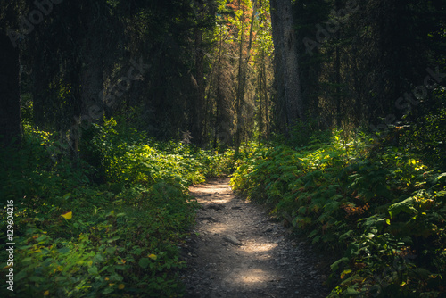 © RyanTangPhoto, Obraz premium Forest path dappled with sunlight.