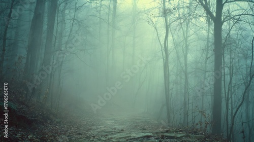 Obraz premium Forest path disappearing into thick fog with bare trees, creating a...
