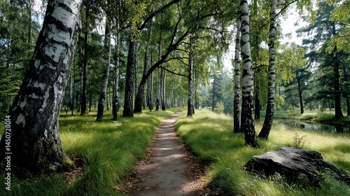© regulator, Fototapeta premium Forest path flanked by birch trees