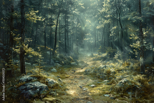 Obraz premium forest path illuminated by soft light breaking through the treetops.