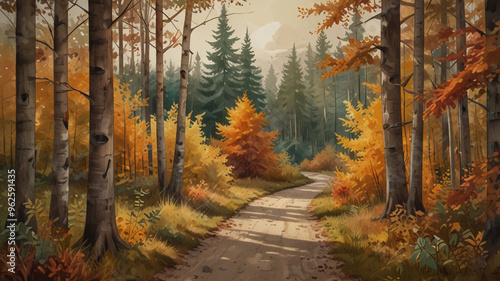 © upali, Fototapeta premium Forest Path in Autumn with Soft Light and Shadows
