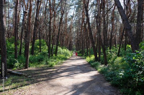 © Tetiana, Naklejka premium Forest path in spring season perspective road. Tall pines and green bushes below, rest in the forest in early spring. A clear spring day.