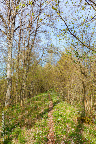 Naklejka premium Forest path in spring with blooming anemones and greenery trees