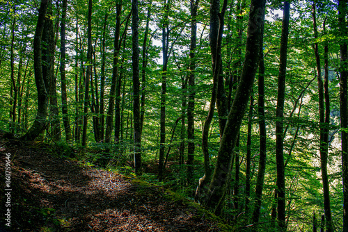 © Nikolaos, Fototapeta premium forest path in the forest under grown green trees