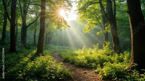 Obraz premium Forest path is illuminated by the sun, creating a peaceful and serene...