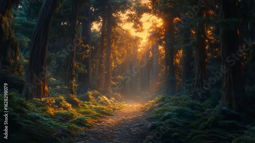Fototapeta premium Forest path is lit by the sun, creating a warm and inviting atmosphere
