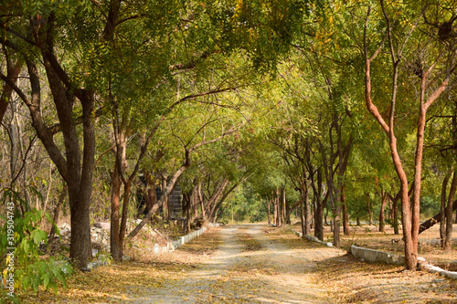 Naklejka premium Forest path landscape. Forest dirty road view. Forrest pathway landscape....