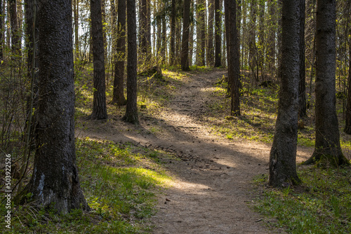 Fototapeta premium Forest path leading through the forest on a sunny spring day