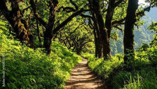 © Ariep, Obraz premium Forest Path Leads Through Sunlit Trees with Lush Greenery, and Outdoor Nature Scene.