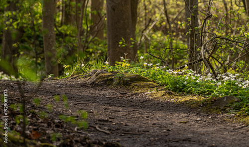 Naklejka premium Forest path lined with blooming wood anemone Anemone nemorosa under early...