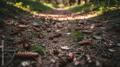 © Tech, Fototapeta premium Forest Path Lined with Pinecones and Moss, Golden Sunlight Dapples the Ground