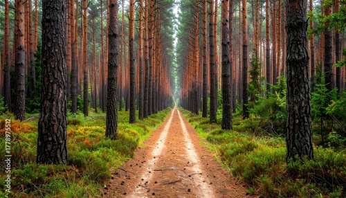 Fototapeta premium Forest path lined with tall pine trees leading into the distance during...